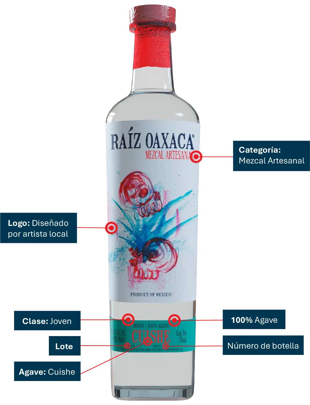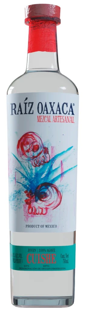 La imagen de MEZCAL RAÍZ OAXACA fué diseñada por un artista local, y hace referencia a la tradición más importante de nuestro estado, el día de muertos, que se celebra cada día 2 de noviembre. Para las familias Oaxaqueñas es una tradición colocar altares ese día, los cuales se adornan con flores, comida y bebida, ya que la tradición cuenta que esa noche nuestros seres queridos que ya no están con nosotros vienen a visitarnos, y nosotros los recibimos con lo que más les gusta; comida y mezcal.